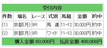 上記情報馬のワンツー決着となり、馬連9.4倍的中、ワイド4.2倍的中で40万8000円の払い戻しとなりました。