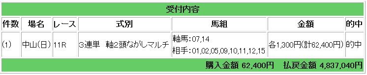 会員様情報では1グレイトパールからの馬単4点指示で17.6倍的中となり、13万2000円の払い戻しとなりました。